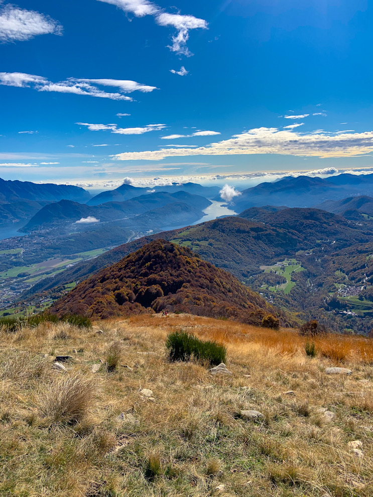 Quindi ecco, per arrivare in cima bisogna fare uno sforzo in più! Però ne vale davvero la pena. Fatti gli ultimi metri ci si ritrova infatti spiazzati da un panorama pazzesco. La vista è a 360 gradi e in una giornata splendida e tersa come quella di oggi si vede tutto. Dalla Cima dell’Uomo al Pizzo di Claro, dal Camoghé al Gazzirola passando per il Monte Bar, dai Denti della Vecchia al Monte Boglia, dal Generoso al San Salvatore, dal Monte Lema al Monte Tamaro. E in lontananza la Dufourspitze. E chissà quante cime sto dimenticando. Voilà: ora è davvero il momento di sbizzarrirsi con scatti e selfie panoramici.