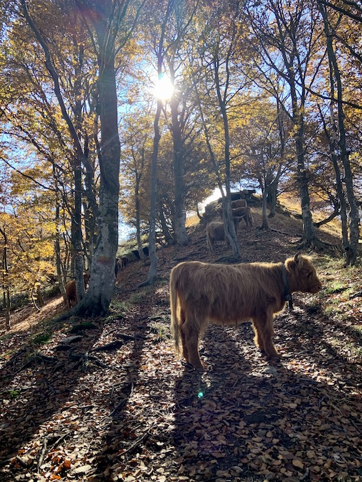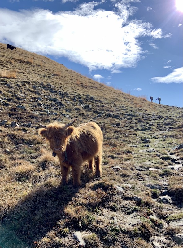 Seguiamo il sentiero che svolta a destra. In linea d’aria manca davvero poco, sì, ma l’ultimo pezzo è bello in piedi e, soprattutto, sul percorso riposano in modo molto poco pacifico diversi cuccioli di highlander, le mucche scozzesi. Non è che hanno proprio voglia di lasciarci passare: oltre a guardarci di sbieco masticando erba ci fanno sentire veramente due intrusi! Ma la fortuna è dalla nostra parte: accanto a noi c’è un gruppo di ragazze intente a fare pic nic e quindi i simpatici padroni di casa sono più attratti da loro e noi riusciamo a passare un po’ di corsa e (quasi) inosservati.