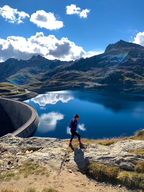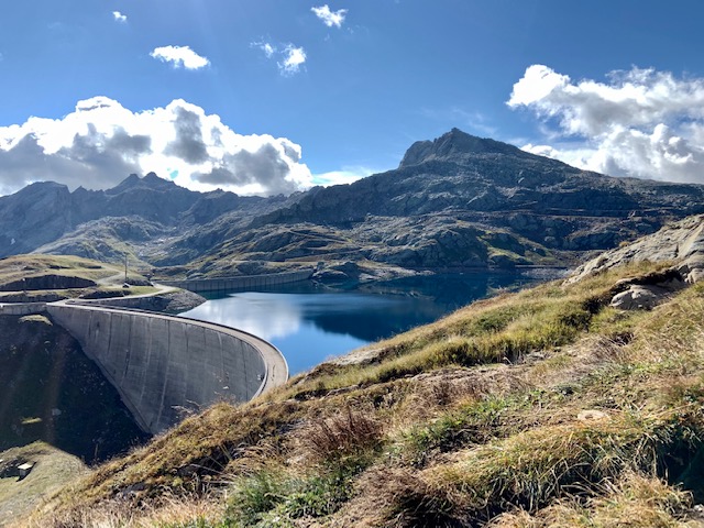 Parcheggiamo l’auto poco sotto la diga e con grande sorpresa, pur essendo già le 10.30, siamo i primi. Ci avviamo a piedi percorrendo la strada asfaltata che, dove si incrociano le due dighe, va verso destra. In cinque minuti arriviamo ai cartelli gialli e, inizialmente, seguiamo le indicazioni che portano verso la Capanna Cristallina. Vi è subito uno strappetto non indifferente, che però porta a un punto molto panoramico, con una vista spettacolare sulle due dighe e sul lago. Quest’ultimo è di un colore incredibile e brilla sotto il sole settembrino.