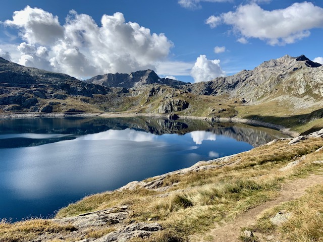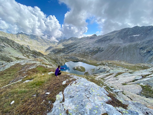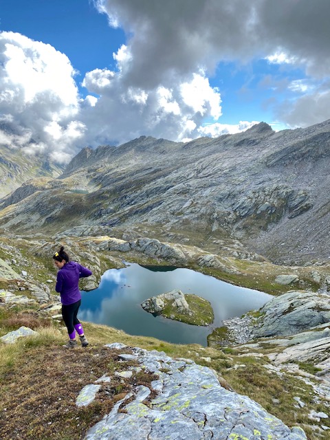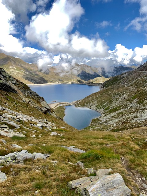 Il laghetto Laiòzz appare d’improvviso in tutta la sua meraviglia. Rimane sotto il sentiero ed è di un blu tanto luminoso quanto scuro e al suo centro ha un isolotto che lo rende unico. Si trova in una sorta di conca e deve in parte il suo colore alle pietre che lo circondano e alle montagne attorno che lo guardano dall’alto. Pure noi lo guardiamo all’alto, esasiati! Anche le nuvole che corrono in cielo contribuiscono a rendere lo scenario estremamente affascinante.